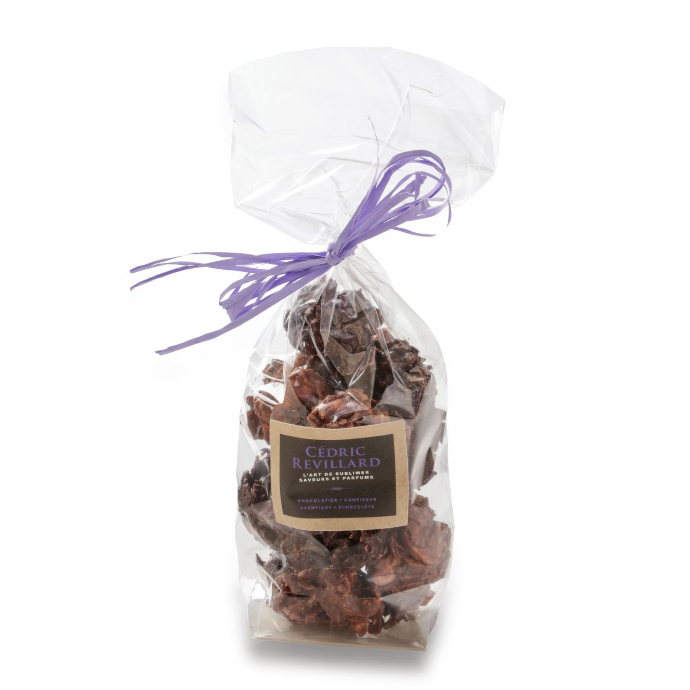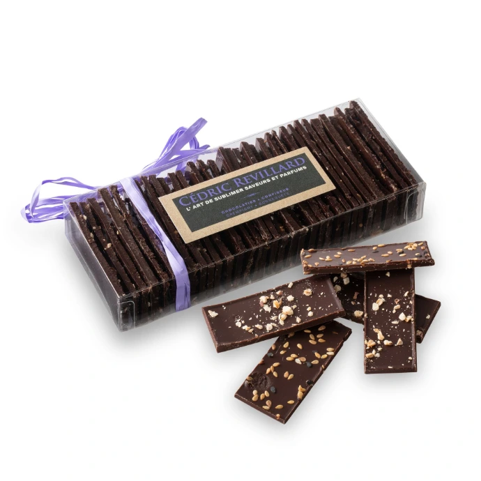 Base de crêpe dentelle avec noisette, orange confite ou graine de sarrasin en fonction du chocolat ( Blond, Noir, Lait)